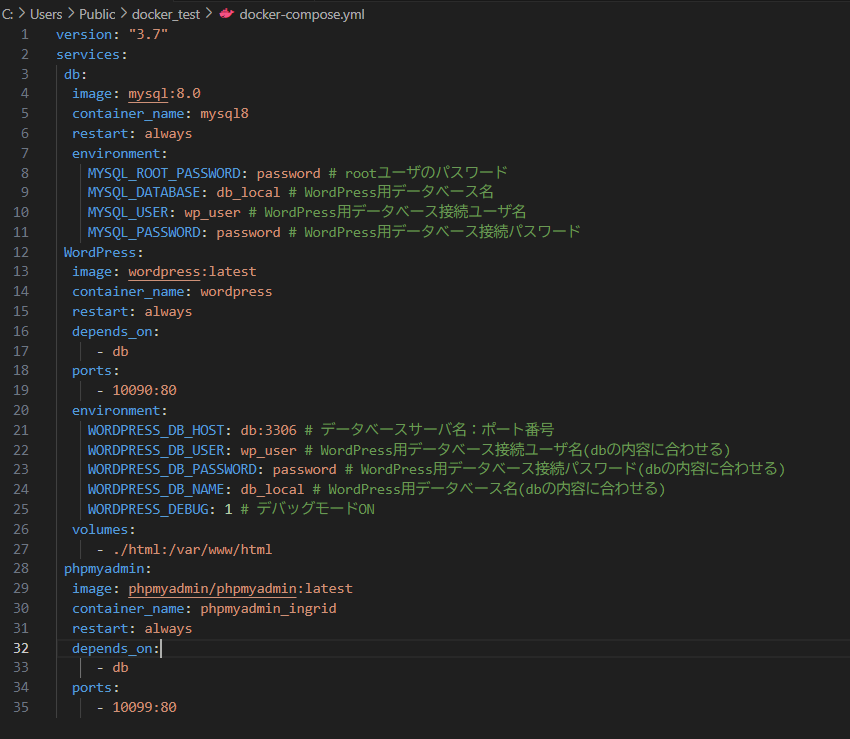 docker-compose.ymlはDocker Composeの設定ファイルで先程作成したフォルダのルートディレクトリに配置します。